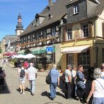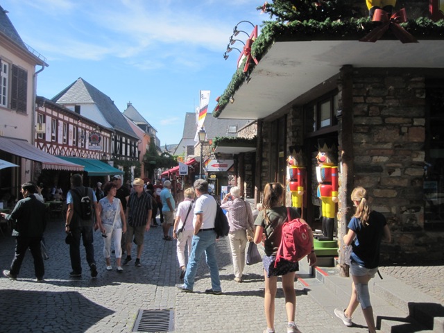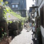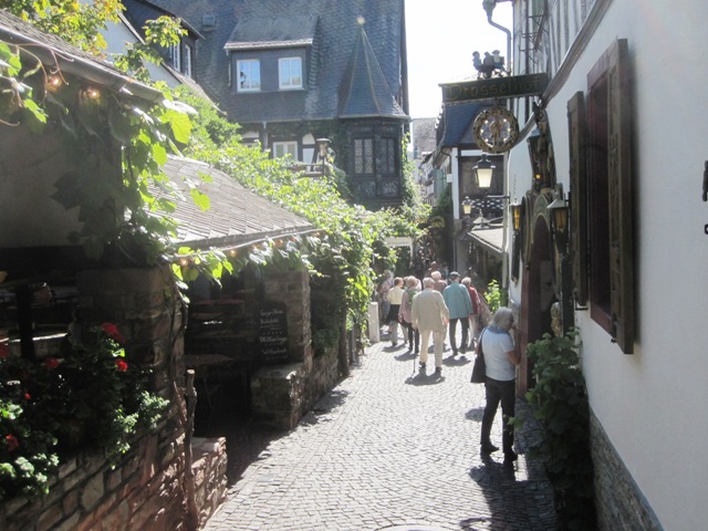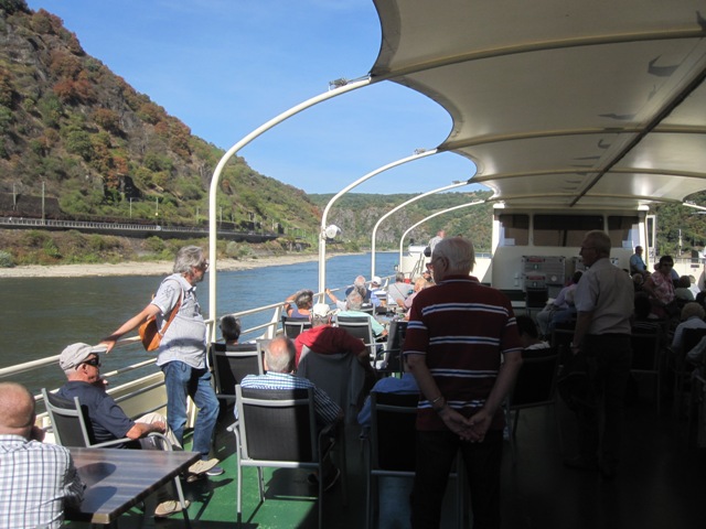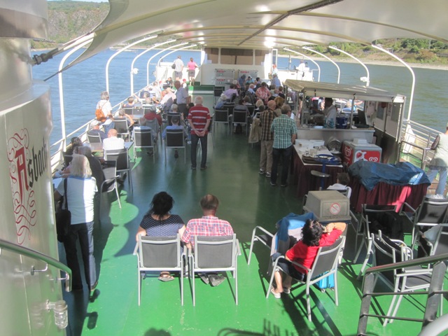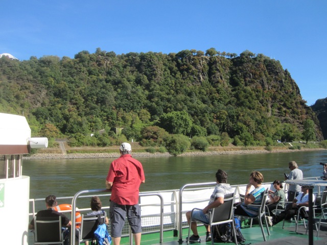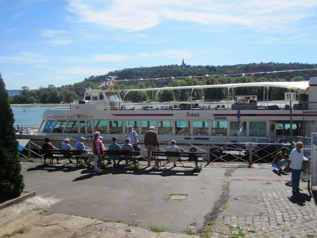 Da der Bus das Niederwalddenkmal nicht direkt anfahren konnte, ging es weiter nach Rüdesheim. Dort fuhren die Teilnehmer dann mit der Seilbahn auf den Berg. Nach der Besichtigung des Denkmals und einem Stadtbummel (u.a. durch die Drosselgasse) wartet um 14 Uhr das Schiff, die MS „Asbach“ am Anleger auf uns. An Bord gab es das Mittagessen. Bei schönem Wetter konnte man die Fahrt auf dem Rhein an Deck genießen. Die vielen Burgen und die Loreley waren schon sehenswert.