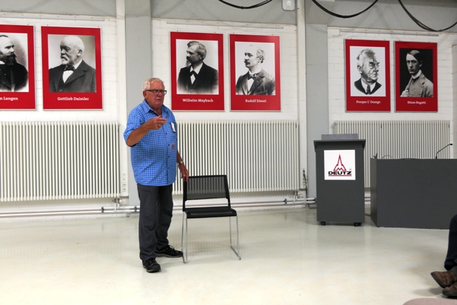 Die Gruppe des SBR besuchte auch die Montagehallen der Deutz AG, wo die Motoren individuell für die Kunden zusammengebaut werden. Heute baut die Deutz AG mit 4.400 Mitarbeitern bis zu 31.500 Motoren pro Jahr. Diese Motoren sind sogenannte Dauerläufer und werden in kleiner Stückzahl als Spezialmotoren für Großmaschinen oder Stationär Motoren von 2 bis 16 Zylinder gebaut.