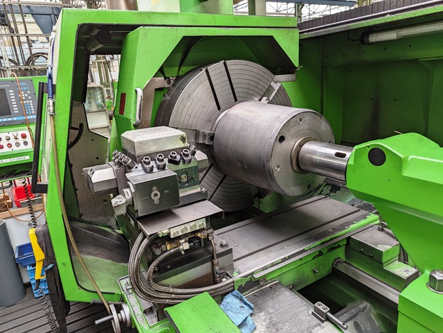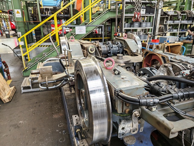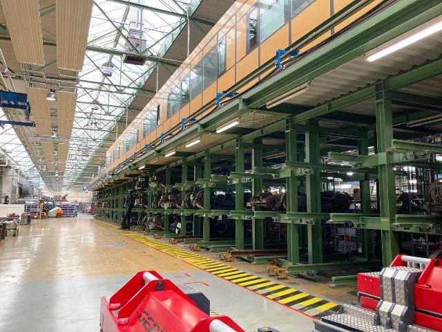 In den Hochregalen werden die Ersatzteile für Straßenbahnen gelagert. Räder werden als Rohlinge geliefert und von den Mitarbeitern auf großen Drehbänken auf das richtige Maß gedreht und danach auf die Achse gepresst.